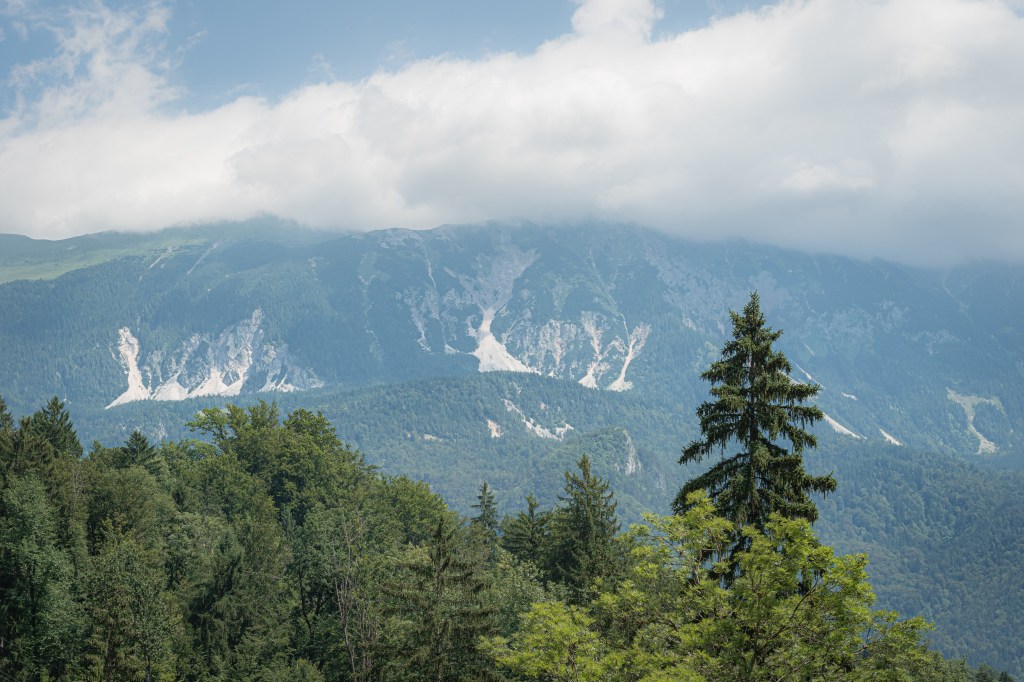 On our walk from the station to Lake Bled I spotted this tree extending out above the rest. For reason of simplicity, I took the photograph to capture the mountainous terrain. The tree however, still takes the centrepiece.